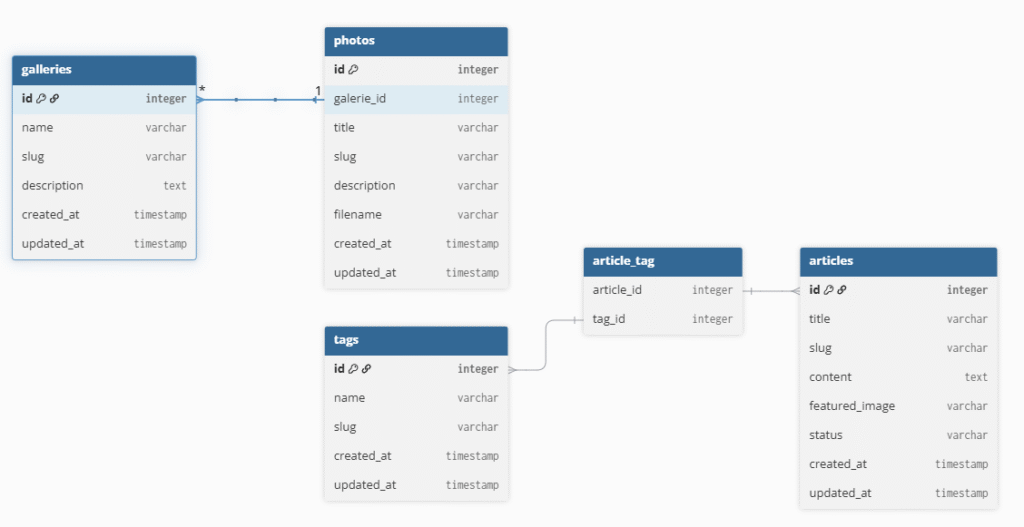 L’application online https://dbdiagram.io/ nous permet de dessiner la structure de notre futur base de données. Encore une fois ici pour notre site, ce n’est pas très complexe, nous aurons uniquement 4 tables. La table user (déjà définie par laravel), la table galleries (qui contiendra toutes les sous galeries), la table photos et la table articles. Suivant la taille du projet, cela peut cependant vite devenir une vrai usine à gaz.
