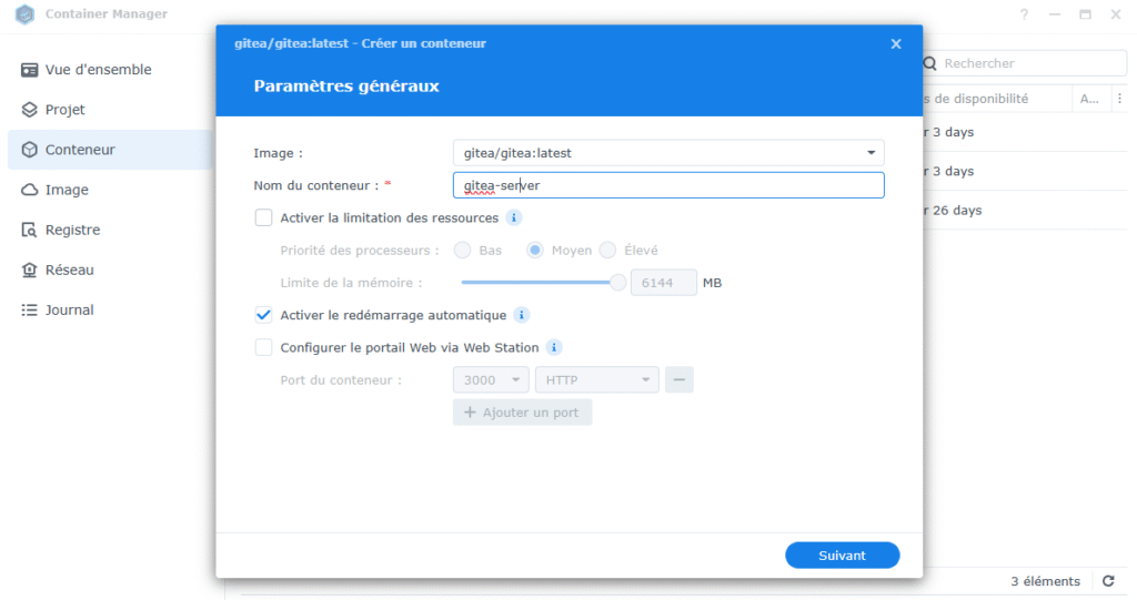 Va ensuite dans Conteneur, cliques sur Créer. Dans la nouvelle fenêtre, entre les informations suivantes: – Image : gitea/gitea:latest – Nom du conteneur : gitea-server (par exemple, ou ce que tu veux) – Coche Activer le redémarrage automatique (si ton NAS redémarre le conteneur redémarrera aussi)