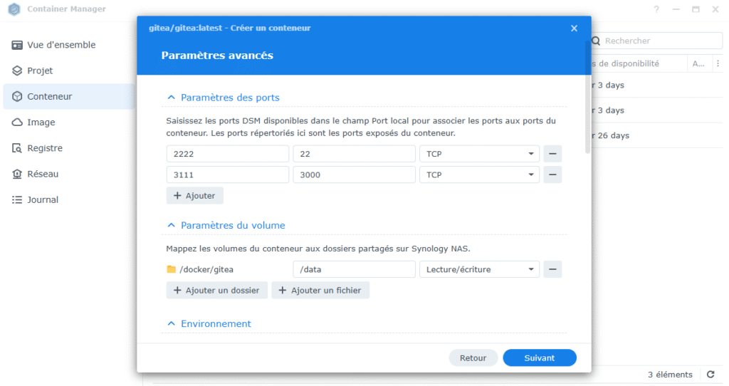 Sous Paramètres des ports, choisis les ports d’écoute de ton futur conteneur, par exemple 2222 pour SSH et 3111 pour le port d’accès à l’interface web de Gitea (les ports doivent être libres et non utilisés par ton Synology).