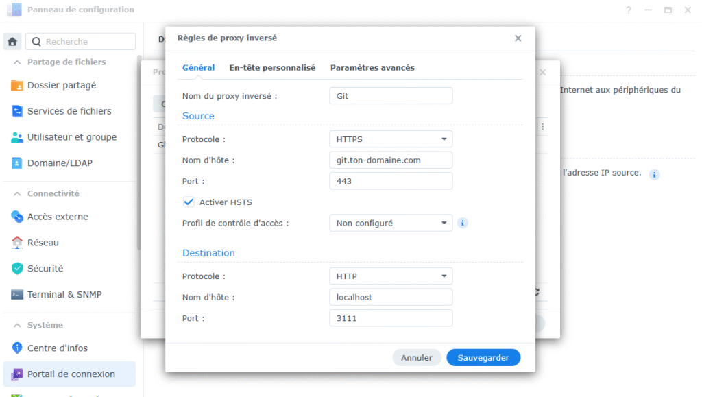 Entre les informations suivantes sous Source : – Protocole : HTTPS – Nom d’hôte : git.ton-domaine.com – Port : 443 – Coches Activer HSTS